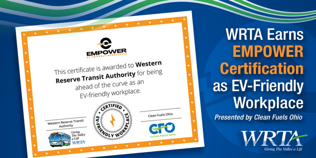 The EMPOWER Certification highlights WRTA’s leadership in supporting employee and public EV charging infrastructure, developing EV-friendly policies, and actively contributing to clean transportation initiatives in the Mahoning Valley.